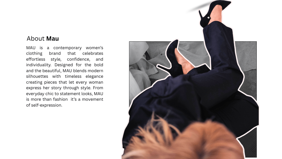 The MAU logo represents bold femininity and contemporary fashion sensibility. The strong, cropped typography conveys confidence and individuality, while the sharp cuts and clean geometry introduce a modern, editorial edge. The monochrome palette reinforces versatility and timeless appeal, allowing the brand to feel both expressive and refined. Overall, the logo communicates strength, elegance, and self-assured style, positioning MAU as a modern women’s fashion brand designed for confident, fashion-forward expression.